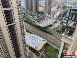 武汉建安街跨线铁路桥东主塔墩1.4万吨梁体18日仅用70分钟就完成了逆时针83度旋转,并在京广铁路线上成功实现了与此前已完成旋转的西主塔墩箱梁无缝对接。